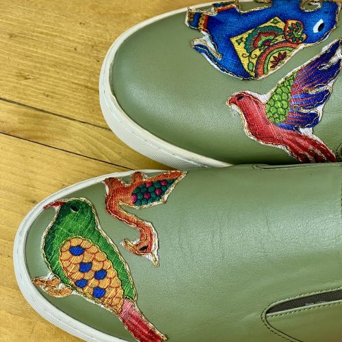 کفش دست‌دوز زنانه با طراحی منحصربه‌فرد و تزئین پارچه رنگی سنتی – ترکیبی از هنر، راحتی و اصالت.