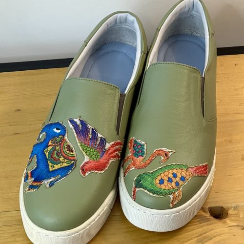 با افتخار به شما کفش دست‌دوز زنانه “آرامتا” را معرفی می‌کنیم – ترکیبی چشم‌نواز از هنر اصیل ایرانی و طراحی مدرن. این کفش با دقت و ظرافت توسط هنرمندان ایرانی دوخته شده و با پارچه رنگی سنتی تزئین شده است تا جلوه‌ای خاص و چشم‌گیر به استایل شما ببخشد.